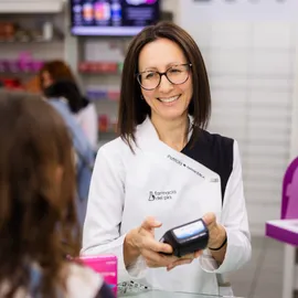 Farmacéutica encargada de la formulación magistral y el SPD (sistema personalizado de dosificación), la más veterana de la farmacia. Habla inglés.