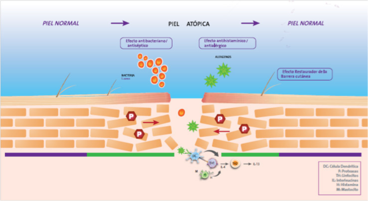 La dermatitis atópica se produce cuando la capa más externa de la piel, la epidermis, se desestructura, por ese motivo las células están unidas con menos fuerza.